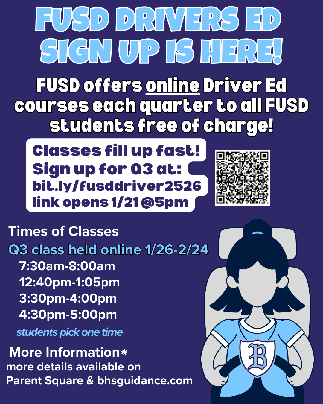 To enroll, students need to fill out the enrollment form at bit.ly/fusddriver2526 at 5pm on the enrollment date above. The link will not be available until the listed day/time.