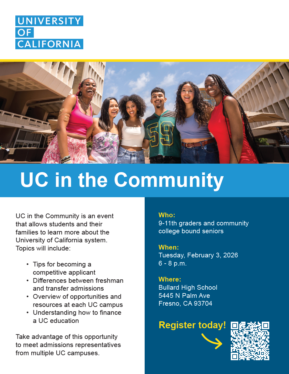 UC will be at Bullard High on Feb. 3! This is a great opportunity to see what their campuses have to offer. Register to attend at: https://apply.admissions.uci.edu/register/?id=30fe109c-7e40-4da0-a7b3-7dce63172fee