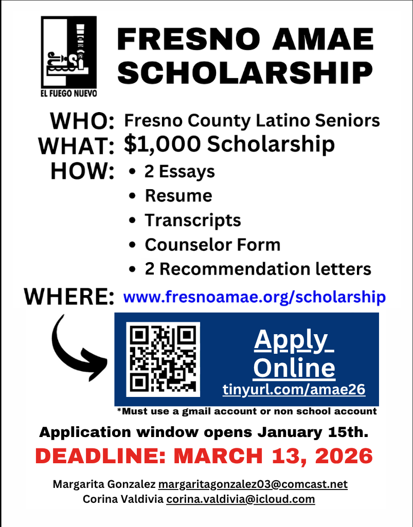 | Fresno Unified Scholarship Multiple $1,000-$5,000 scholarships per FUSD High School Opens October 1, 2025-March 2, 2026 Deadline is 3/2/26. Apply at: foundation4fusd.org/fresno-unified-scholarship/ |